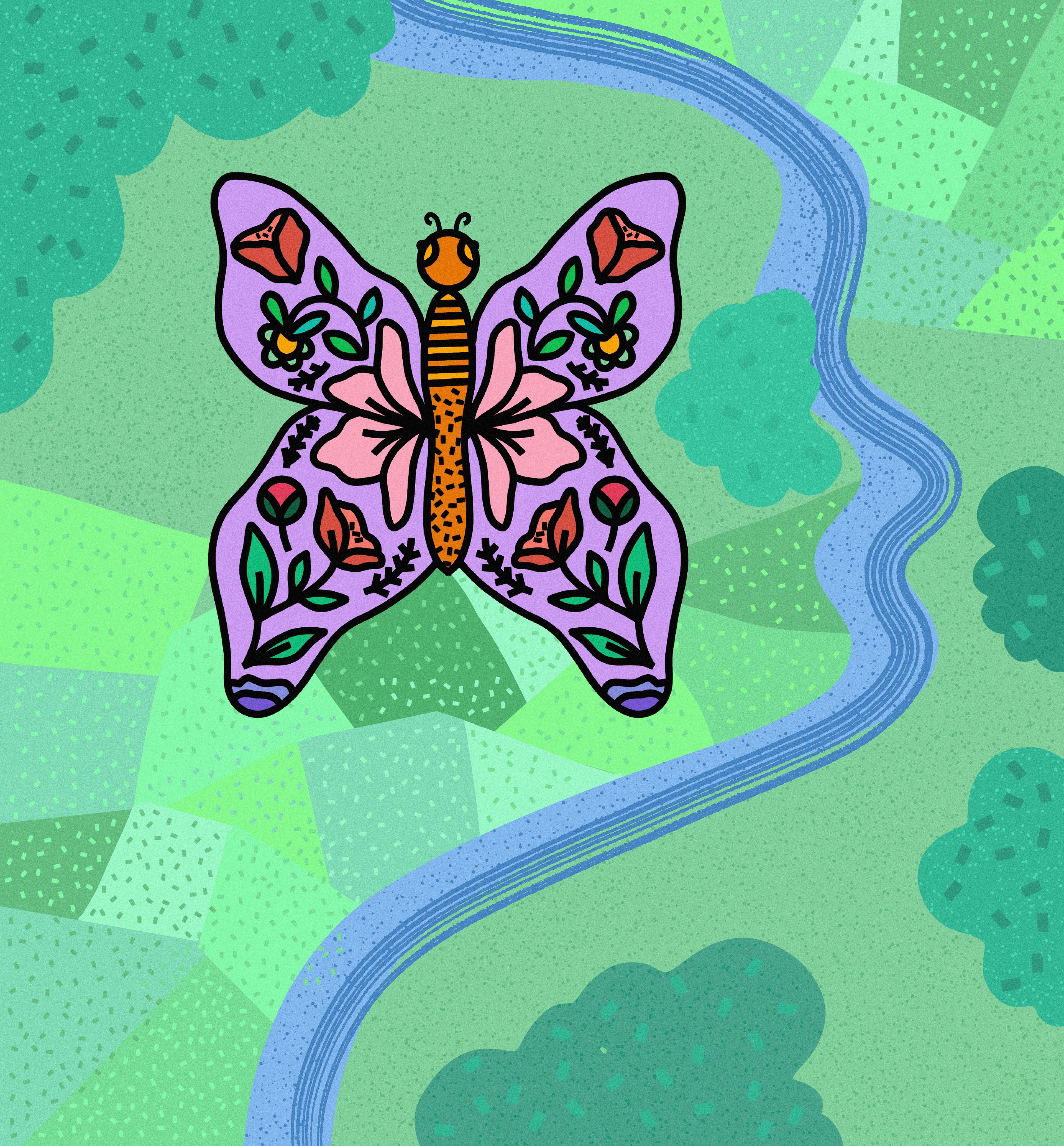 Exploration of sequential illustration to explore character/setting design. First the butterfly close up, finds a flower. Next, we see an overhead of the butterfly flying to it's next destination.