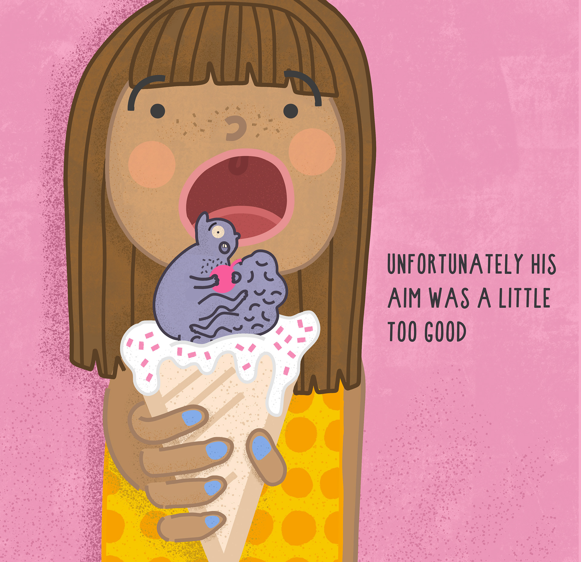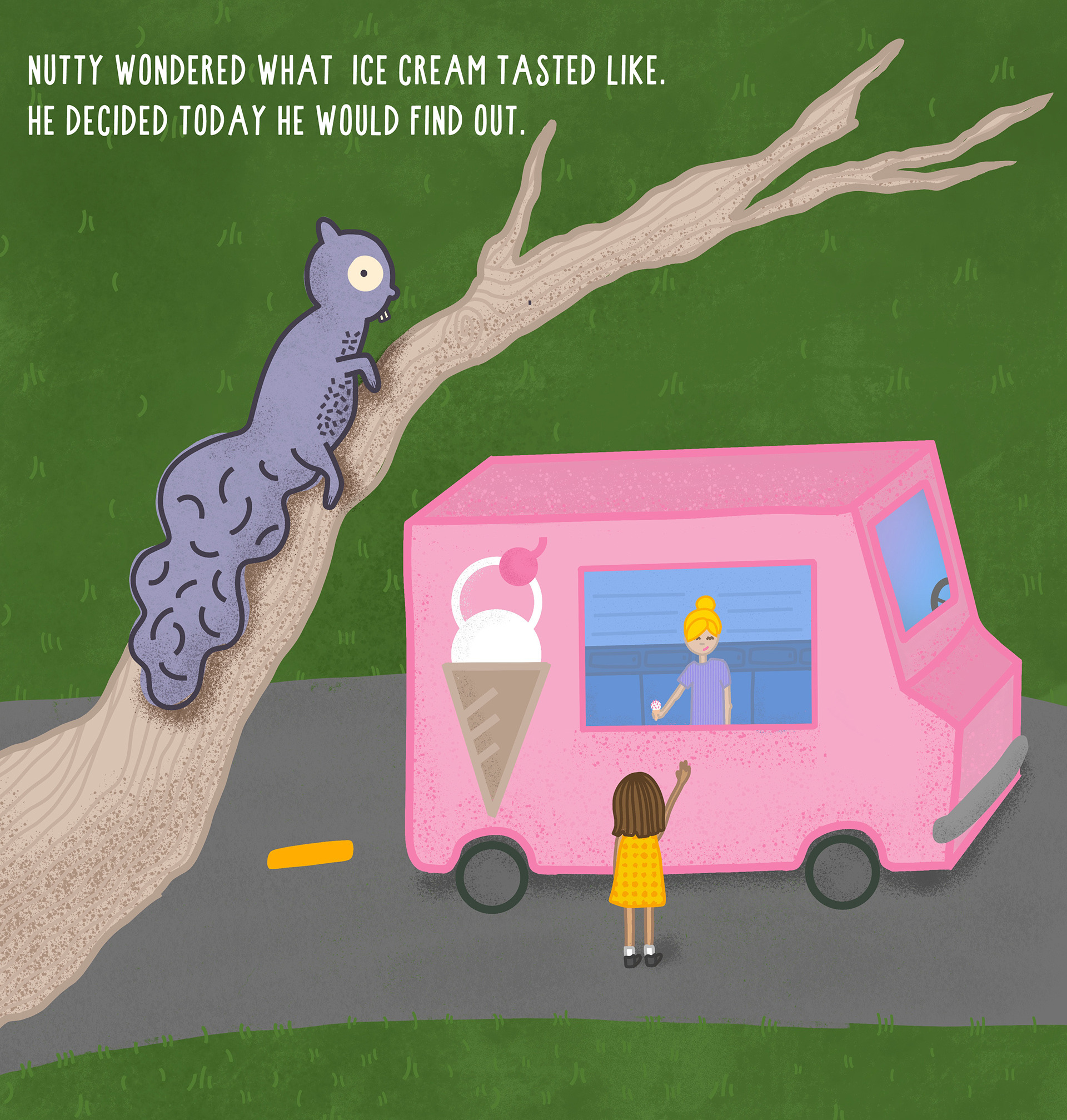 Exploration of illustration to explore character/setting design. Here we see a squirrel discovering an ice cream truck, and finding something he simply must try.